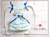 ワンピースの前側は白の布と切り替え、胸元にビーズを飾りました。