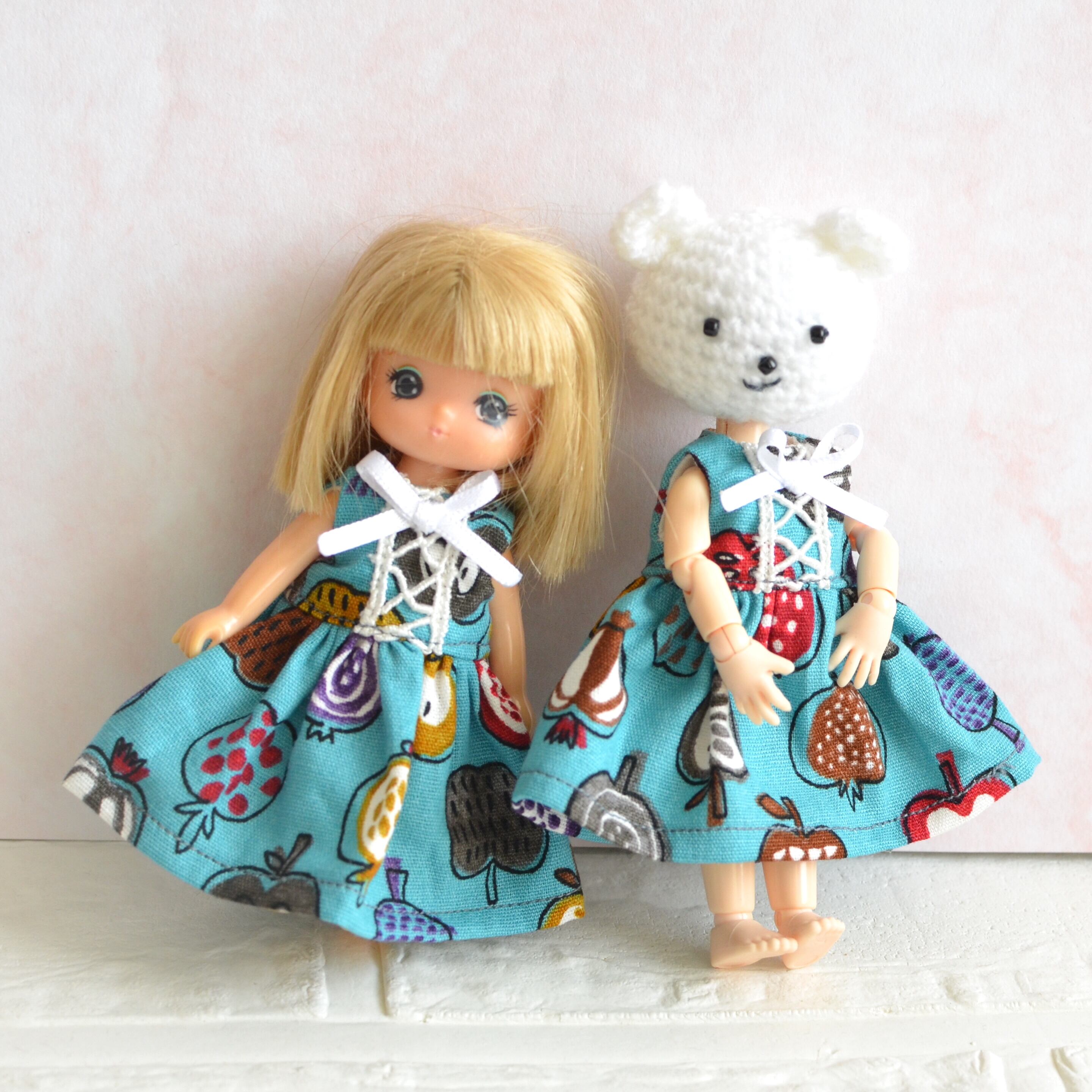 ミキちゃんマキちゃん、オビツ11ボディさんサイズ ブルーとリンゴのワンピース